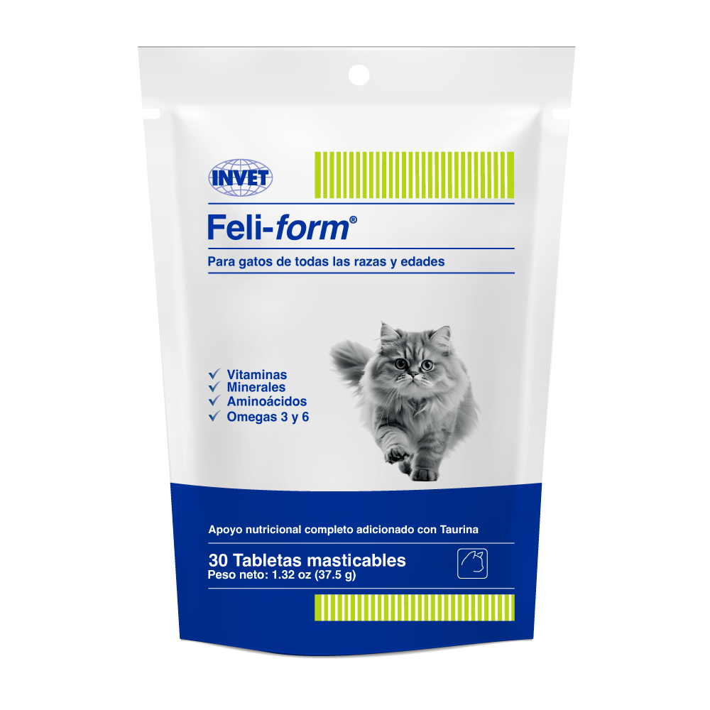 Feli-form de INVET es un suplemento nutricional premium diseñado especialmente para gatos de todas las razas y edades, incluyendo cachorros, adultos, y gatas gestantes o lactantes. Formulado como tabletas masticables, este producto brinda una combinación equilibrada de vitaminas, minerales y aminoácidos esenciales que contribuyen al bienestar integral de los felinos domésticos.